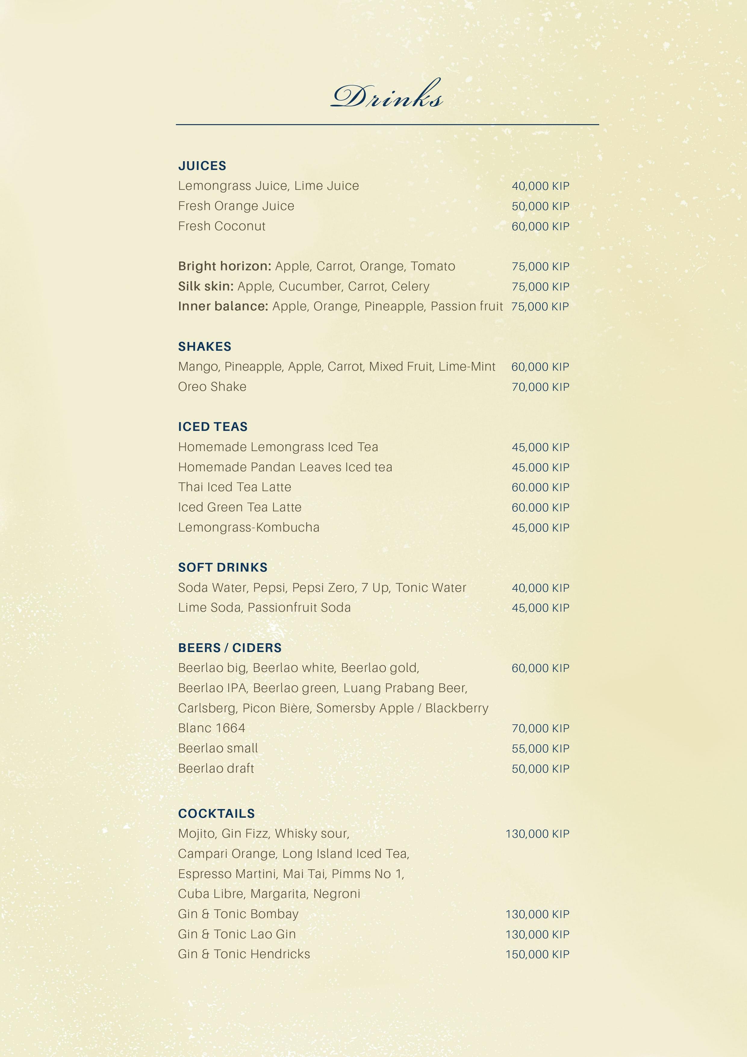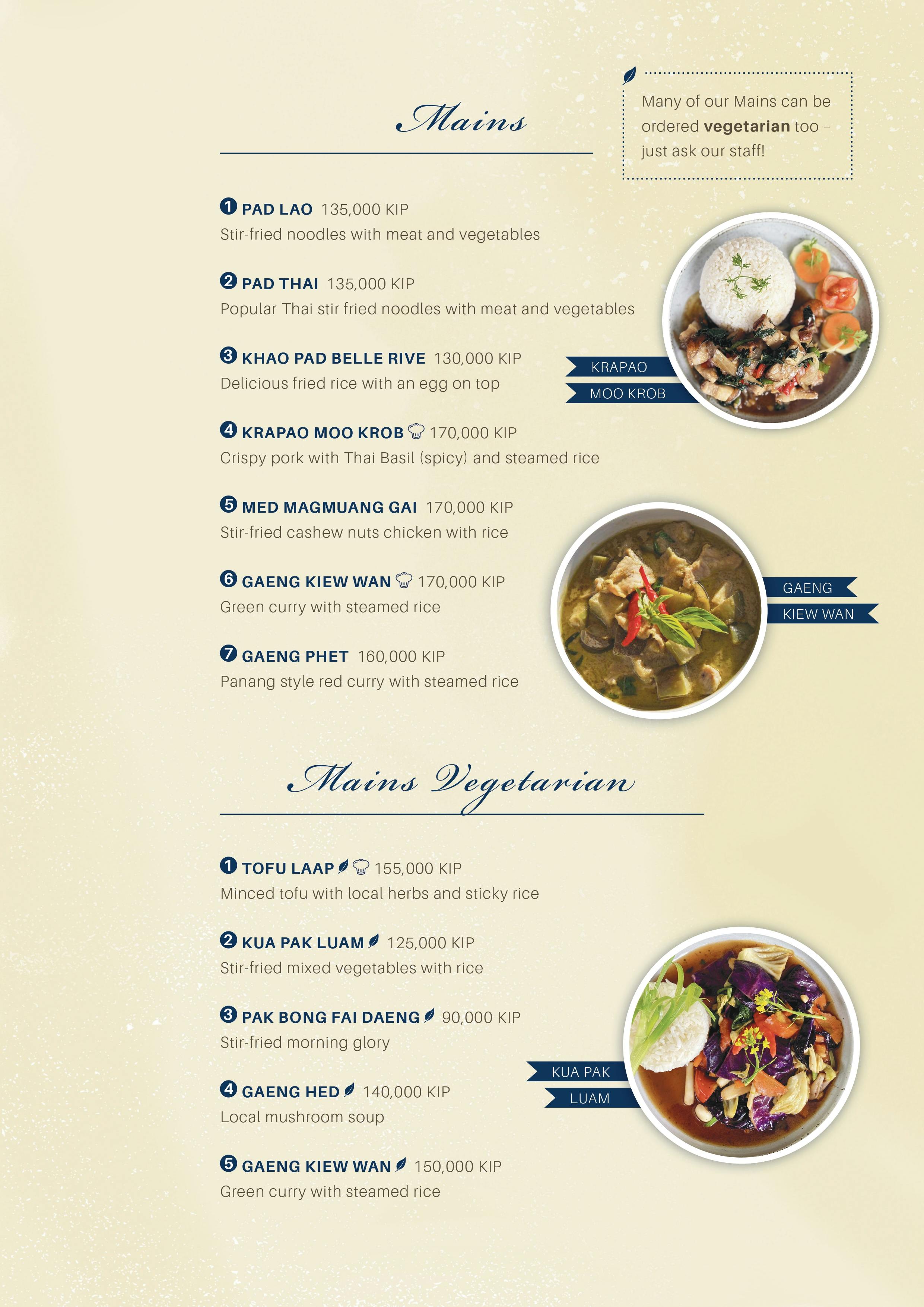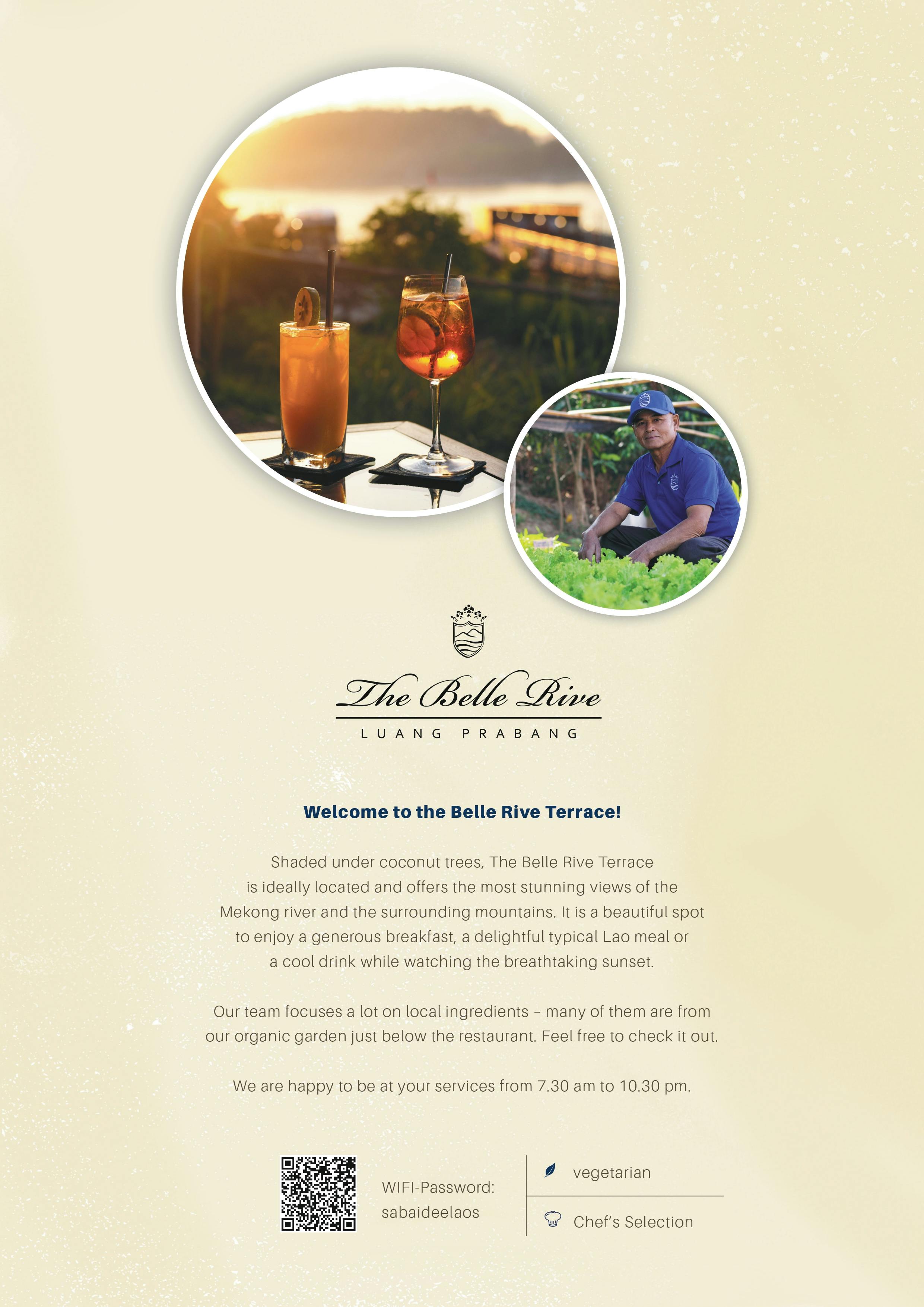 ココナッツの木陰に覆われたザ・ベルリブ・テラスは理想的な空間で、メコン川の水面から対岸まで、最高の景色を満喫できます。程よい朝食、楽しいラオス料理、そして、溜息の出るような美しい夕日を見ながら味わう冷たいドリンク。